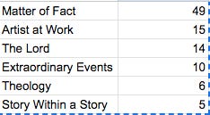 Following closely behind, is “The Lord”. These are stories in which, you guessed it, The Lord is the protagonist. Next is “Extraordinary Events”, then “Theology”, and finally “Story Within a Story”, but let’s just show you the chart: