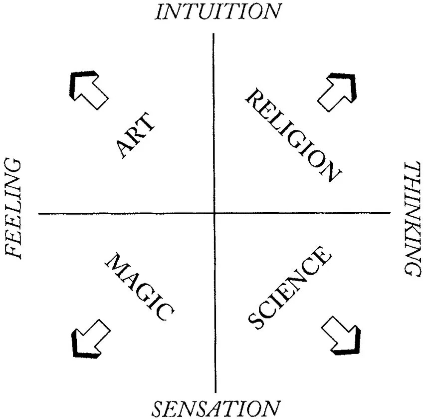 As a seasoned Spiritual Gumshoe, however, I have at least learned not to traverse these streets without my bag of tools, and, when feeling so lost as this, I eventually will remember how helpful it is to stop and consult Ramsey Dukes’ compass. Here, we see that Art and Religion both trek North, guided by Intuition, but they diverge easterly and westerly depending on whether that Intuition is paired with Feeling or Thinking, so treating Writing as a Spiritual Practice is something like trying to travel East and West at the same time. It simply can’t be done and trying to do so will tear you in two.