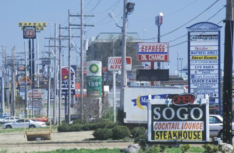 And yet we rattle onward, staring ahead on the morning commute, en route to the job we may or may not loathe, but which nonetheless shapes our life. Out of sleep-rimmed eyes, through the petroleum fog, we gaze upon hedgerows of burger joints and payday loan establishments, and wonder aghast: What have we done? What in God’s name have we done to our Good Earth? Who is this for? And how long can it persist?