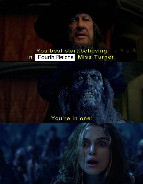 Immediately, it felt the original idea was the way. Writing about the Fourth Reich felt somewhat like discourse-chasing which would cheapen the actual horror of what is happening, but at the same time if it is true that “The Empire Never Ended” then what better time to write about it than when the Empire is acting so brazenly?