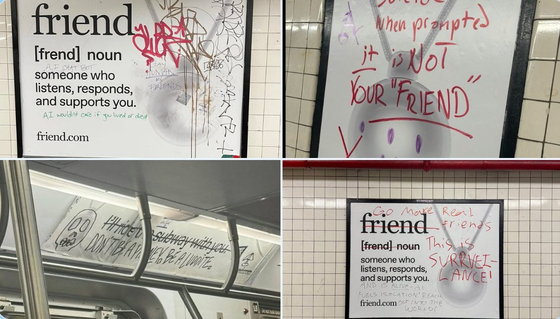 Social media is bursting at the seams with AI videos and images, but somehow I am always surprised to find the people who use it actually roam the real world. I suppose that’s the privilege of having cool, creative friends who are staunchly against it. Still, beyond my little bubble, AI is running amok. Upwards of 80% of college students report they are using it to write or assist in writing essays. Far more nefarious than a little bit of college cheating, 16% of adults report having used AI as a “romantic companion”, and a third of children report that using AI chatbots feels like talking to a friend, with 12% reporting they do so because they have no actual friends. If you thought the rich veins of the Loneliness Epidemic had already been mined out by vulturistic endeavors, I hate to break it to you, but we are just getting started. Meet friend.com, a wearable-AI necklace that one can chat with throughout the day.